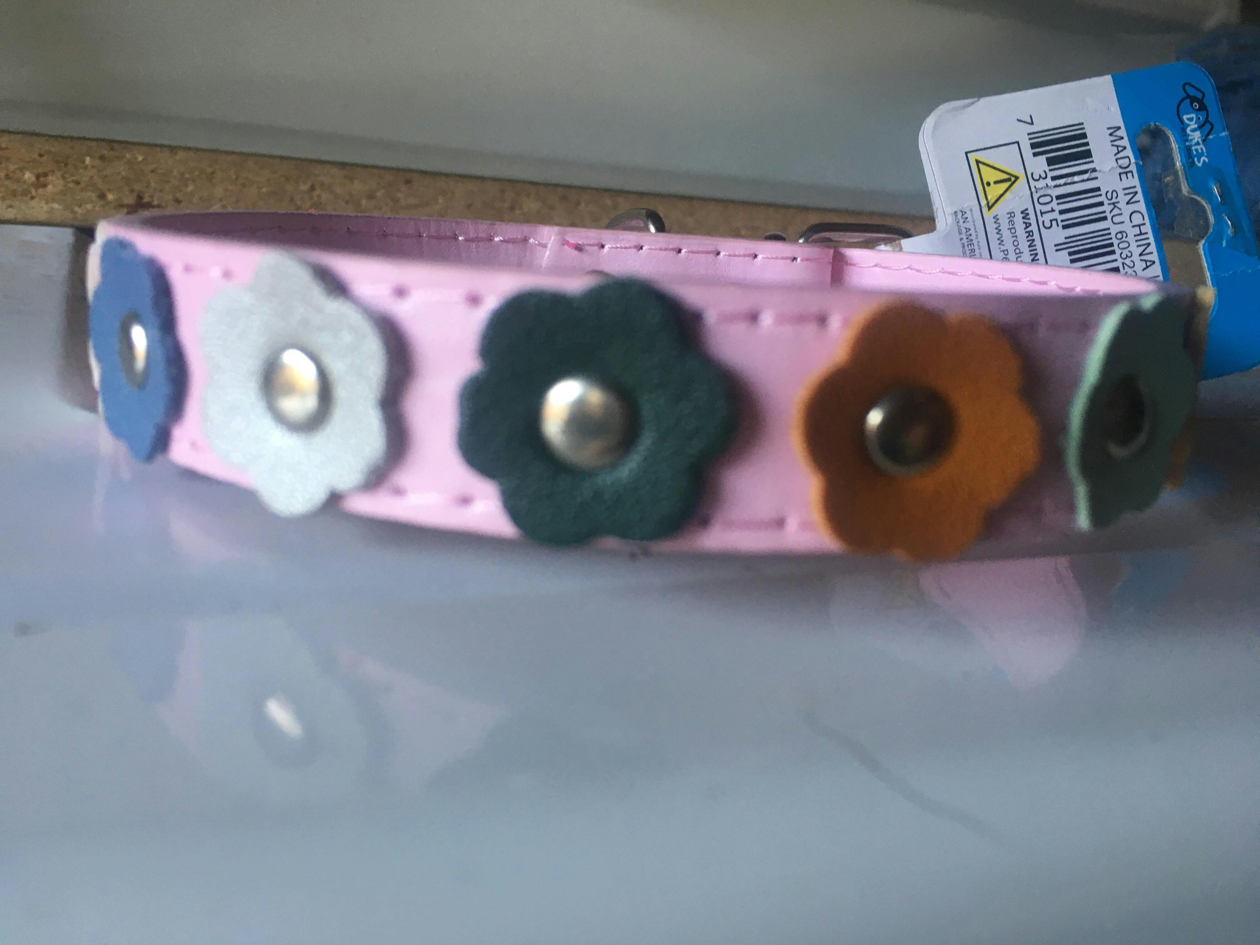 Dress up small size dogs with this fun Flower Dog Collar featuring a durable, faux leather adjustable collar with colorful flower accents and metal hardware. This stylish collar is designed to fit necks up to 14.5" and measures approximately 18" long by 0.75" wide.