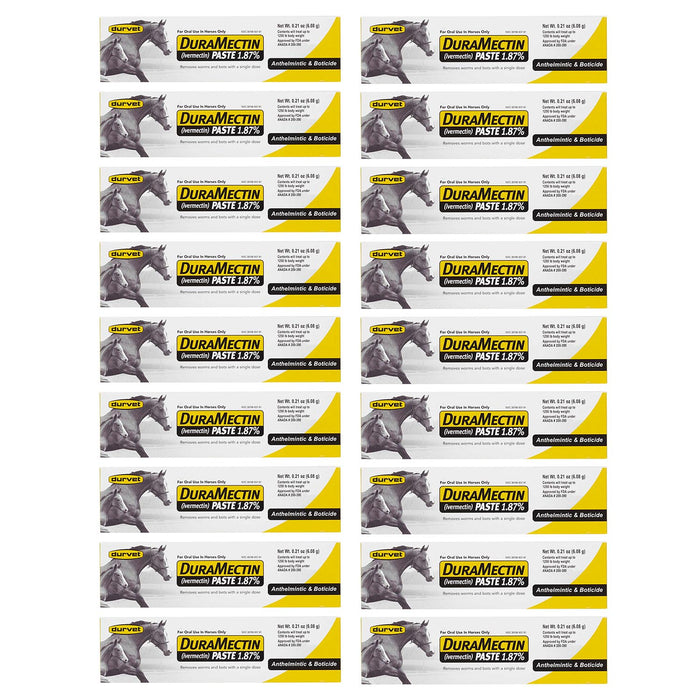 Duramectin Paste provides effective treatment and control of various internal parasites in horses, including large strongyles, small strongyles, pinworms, roundworms (ascarids), hairworms, neck threadworms, large-mouth stomach worms, and bots.